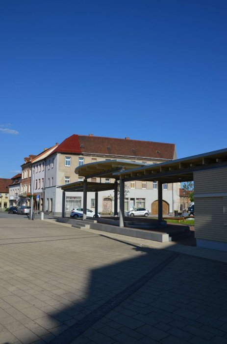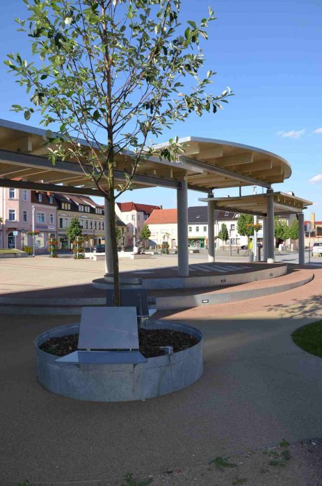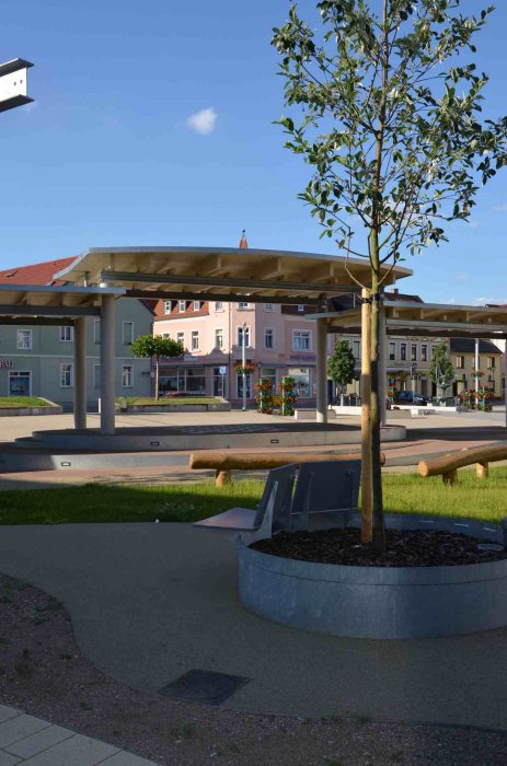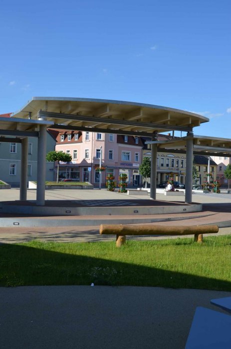 … sollte eigentlich bebaut werden. Es konnte aber über den gesamten Zeitraum niemand gefunden werden, der das Haus betreiben wollte. Für diesen Fall war geplant, dass der bereich räumlich abgetrennt wird. Das Ziel war einen Raumgestaltung zu entwickeln, der den Alten und neuen Marktplatz von dem Grünbereich trennt und dennoch eine Verbindung zulässt. Mit der Pergola entstand so ein überdachter Bereich, der zum Sitzen und Spielen einlädt. Der Bereich wird als Bühnengebäude genutzt und dies kann von beiden Seiten geschehen. Der Grünbereich ist als Ruhezone angelegt, in dem man sitzen und verweilen kann.