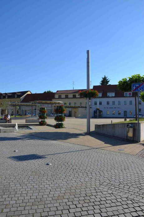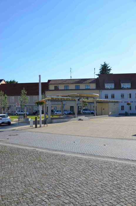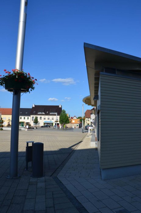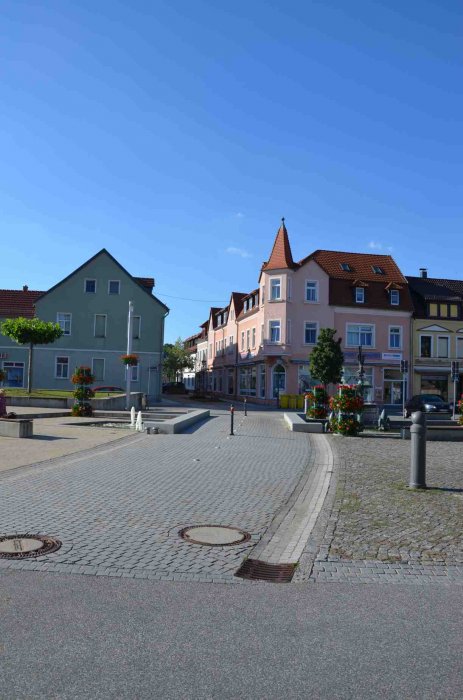 … ist der historische Marktplatz. Dieser wurde mit historischen Materialien saniert. Vor den Geschäften wurden breite Multifunktionsbereiche und Komfortgehzonen  angelegt. Entlang der umgebenden Straßen entstanden Längsparkstreifen für Kurzzeitparker. Weitere Stellplätze sollten in den Randbereichen des Platzes angeordnet werden. Dies war eine wesentliche Forderung der anliegenden Gewerbetreibenden.