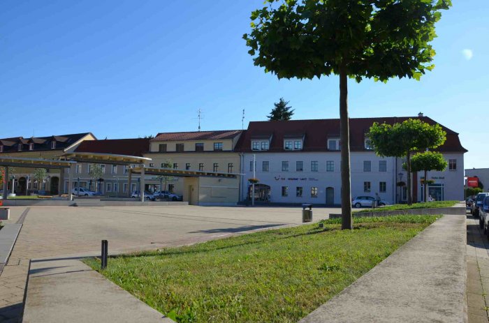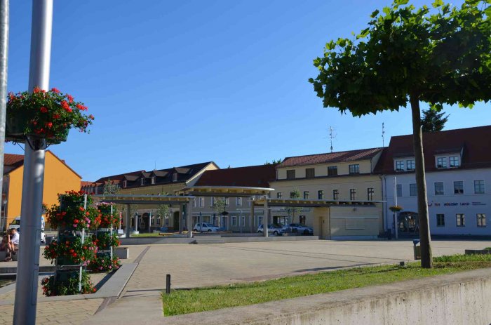 … ist die Platzerweiterung, die durch einen modernen, zweigeteilten  Brunnen mit dem historischen Marktplatz  verbunden ist. Die Verlängerung der Hauptstraße teilt diesen Brunnen. Die Skulpturen des Brunnens sind aus dem alten Brunnen entnommen und im neuen Brunnen neu interpretiert worden.