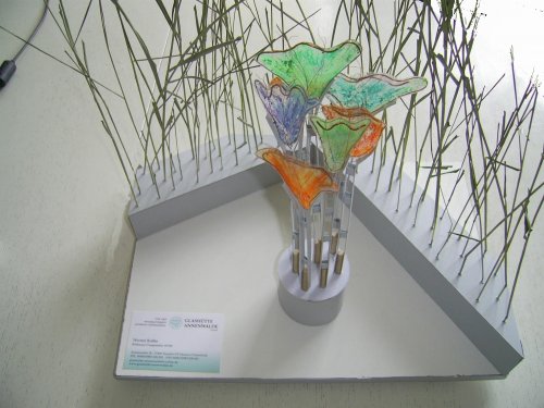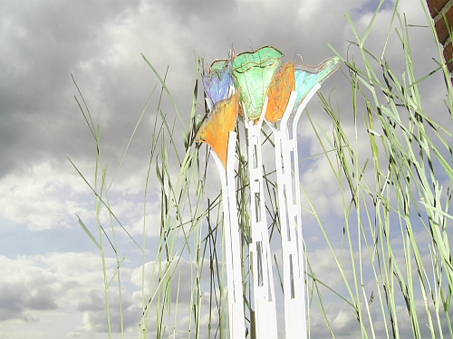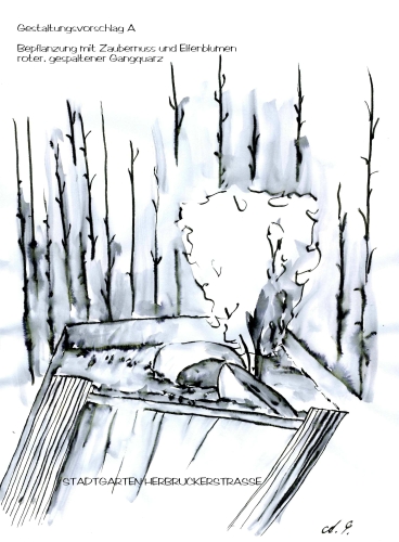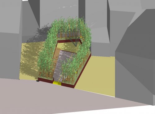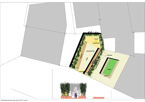 Ich übertrete eine Schwelle aus einer in den Boden eingelassenen Glasplatte und gelange in ein grünes Zimmer, das mich mit seinen großzügigen Sitz- und Liegebänken zum Verweilen einlädt. Mein Blick wird angezogen durch eine interessante Skulptur, die sich aus einem Kiesbeet erhebt. In der Ecke lehnt ein Rechen. Wer hat den hier vergessen? Ich lasse mich auf der Bank nieder und lausche dem leisen Rascheln der Bambusblätter im leichten Wind. Die Geräusche der Stadt kommen plötzlich von weit weg. Ich lege mich auf den Rücken, blicke durch das grüne Bambusblättergeflimmer in den blauen Himmel und entspanne mich. Ich beschließe spontan, mit dem bereitliegenden Rechen ein paar Linien in das Kiesbeet zu malen, bevor ich wieder gehe. Bei dem Versuch stelle ich fest, dass es gar nicht so leicht ist, wie ich vorher dachte. Inzwischen ist die Zeit knapp geworden, und ich muss weiter. Der Ausgang scheint plötzlich ein bisschen weiter entfernt zu sein…Ich werde möglichst bald wiederkommen.