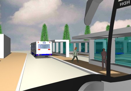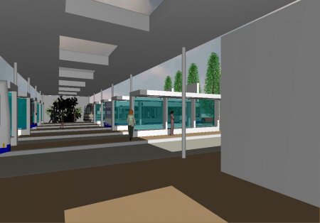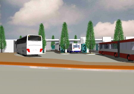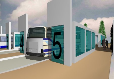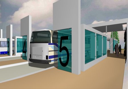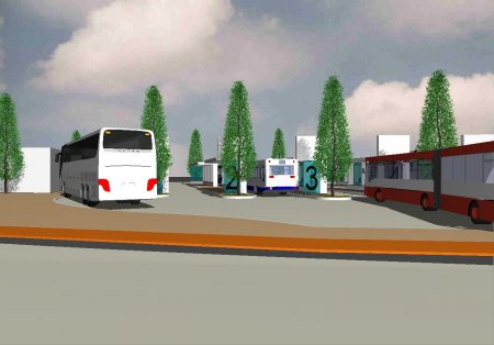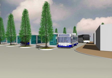 Gerahmt wird der Busbahnhof an den Bussteigen durch Säuleneichen, die den Busverkehr nicht einschränken. So werden die Farbe Weis, Blau und Grün den Raum bestimmen.