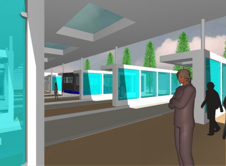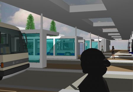 Diese Ziel erreichen wir, in dem wir mit einer aufgelösten, farblich beschichteten Sichtbetonkonstruktion für die Fahrgastunterstände wählen und die Öffnungsflächen mit Glas füllen. Auch die Dachflächen werden regelmäßig durch Glasöffnungen aufgelöst, so dass wir zum einen dem Wetterschutzbedürfnis gerecht werden und gleichzeitig eine helle lichte und freundlich-nüchterne Atmosphäre entsteht.