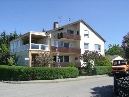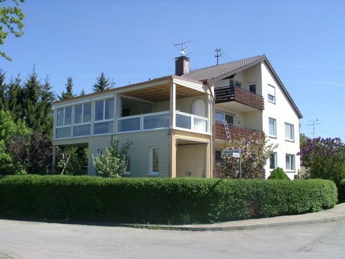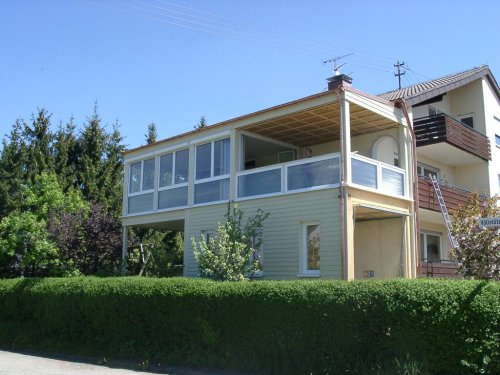 Das Dreifamilienhaus aus den 70er Jahren wurde auf der Westseite mit einem Erweiterungsbau in Holzbauweise ergänzt. Im Erdgeschoss wurde eine Garage für den Campinhganhänger und ein überdachter Freisitz untergebracht, im Obergeschoss die Erweiterung des Wohnzimmers und eine große attraktive Loggia, da der vorhandene Balkon zu schmal war um als Zimmer im Freien zu dienen. Die Glaswand zwischen Wohnbereich und Loggia lässt sich vollständig aufklappen.