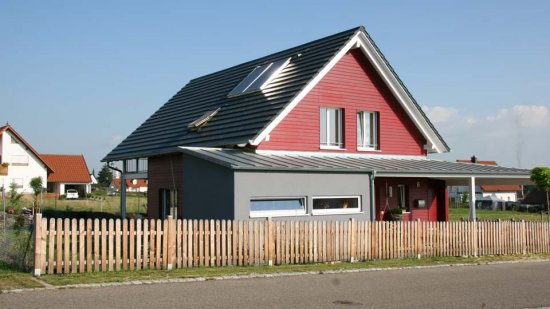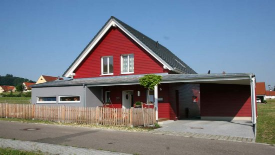 Klein aber fein und ohne Keller kommt dieses Einfamilienhaus daher. Das klare und einfache Hauptgebäude wird zur Straße von einer Flachdachkonstruktion eingerahmt. Carport, Eingangsüberdachung und Hauswirtschaft bilden somit einen eigenständigen Baukörper, der die Baumassen gliedert. Sowohl Farbe als auch Materialien betonen diese Zweiteilung.