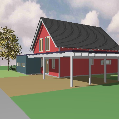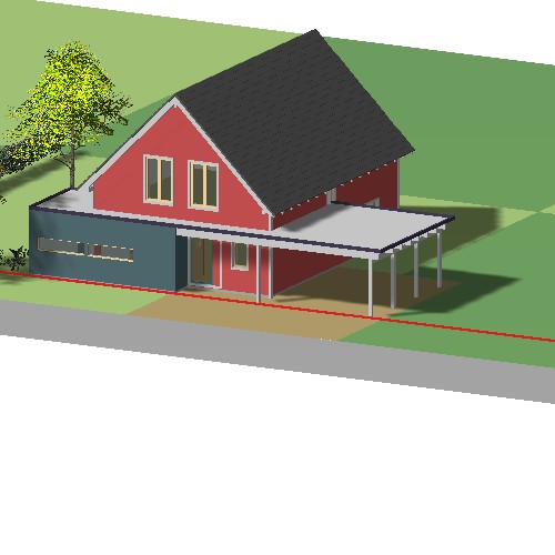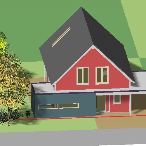 Der Hauswirtschaftsanbau wurde auf die Südseite gelegt und der Küchenbereich formal in den Anbaubereich eingezogen, so dass der Hauswirtschaftsraum nicht mehr als untergeordneter Anbau sondern als Bestandteil des Hauptbaukörpers wahr genommen wird.So steht der Baukörper auf der Baulinie.