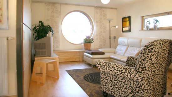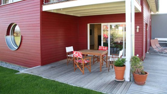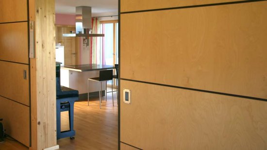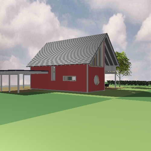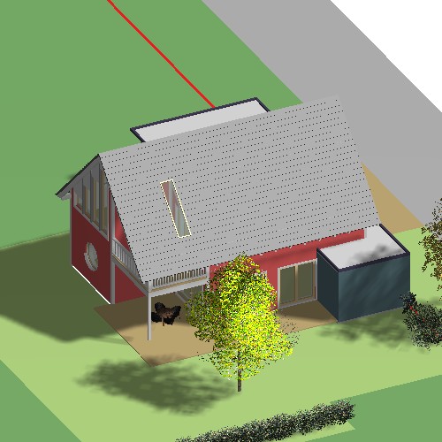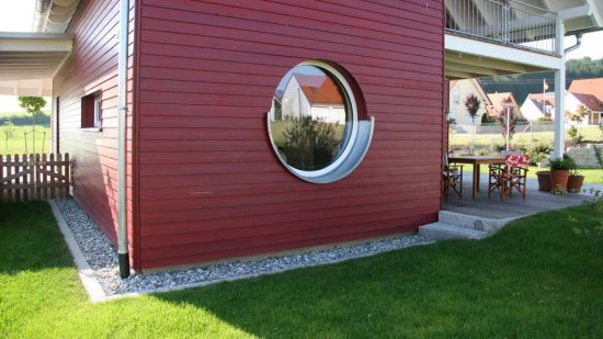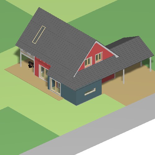 Im Südwesten wurde die Ecke eingezogen, so dass ein attraktiver und geschützter Freisitz entsteht. Das große Schiebefenster im Erdgeschoss verbindet die Terrasse mit dem Essplatz und der Küche. Der kleine Wohnbereich zieht sich in den Nordwesten des Hauses zurück, lässt sich aber durch mobile Wände zum Koch- und Essbereich hin erweitern.