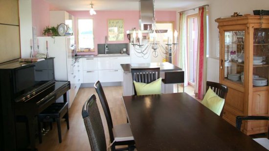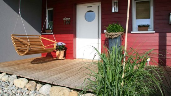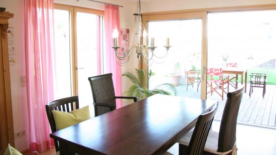 Die große Fensterfront im Westen öffnet den Wohnbereich zur Terrasse und mit dem niveaugleichen Belag und dem stufenlosen Übergang zum Garten fließt Innen und Außen nahtlos ineinander über und gibt dem Haus eine ungewohnte Größe.