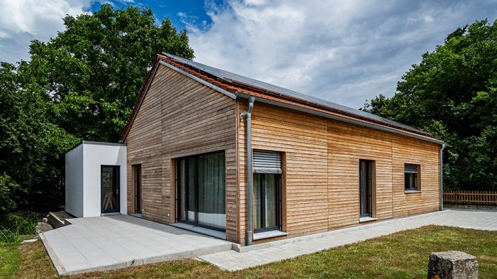 Für einen Singlehaushalt planten wir einen Neubau in Holzbauweise, der Wohnen und Arbeiten unter einem Dach vereint. Durch eine klare Trennung der beiden Funktionen, die sich auch in der Fassadengestaltung widerspiegelt, haben wir die Aufgabe erfolgreich gelöst.